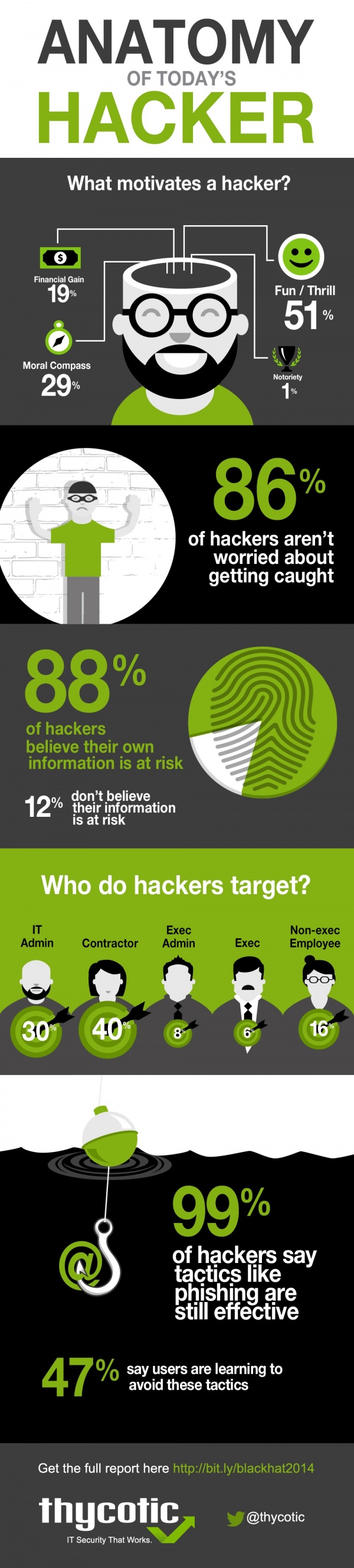 黑帽子黑客如何看待他們所做的惡意活動(dòng)?根據安全軟件公司Thycotic在2014年對127位不同的黑帽黑客所做的調查顯示,有86%的黑帽黑客認為他們的行為不會(huì )造成嚴重的后果。他們中的大多數都認為自己可以凌駕于法律之上。